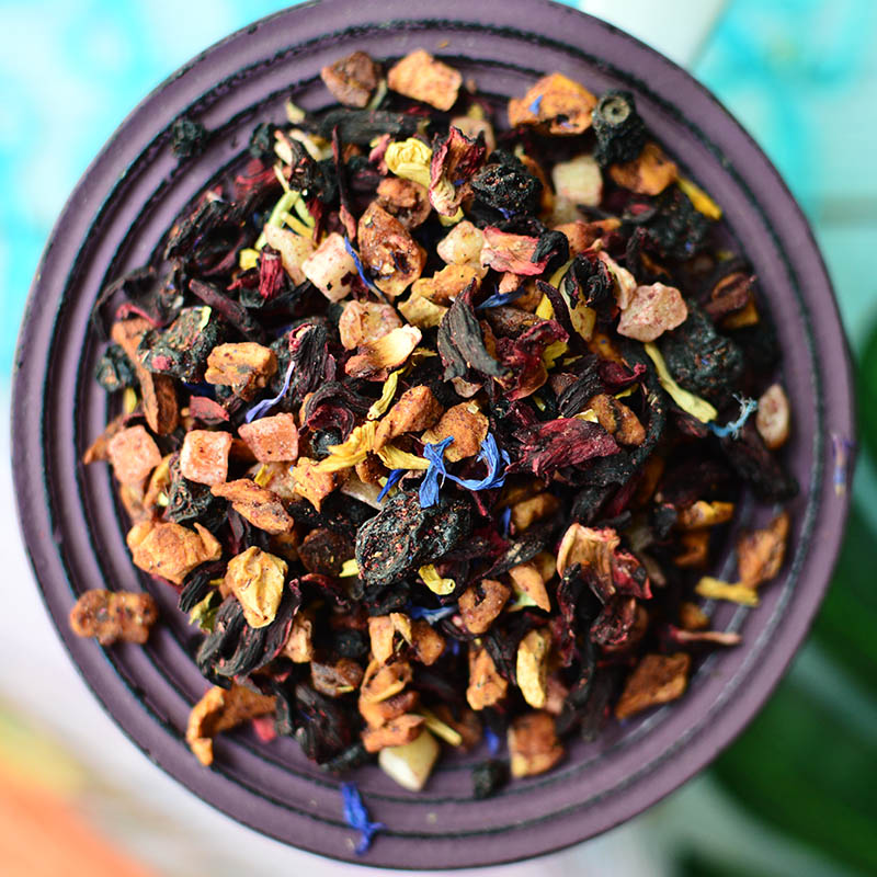 - hibiszkuszvirág, alma darabok, papaya darabok, áfonya, bodza, fekete ribizli, málna-és eperdarabok.