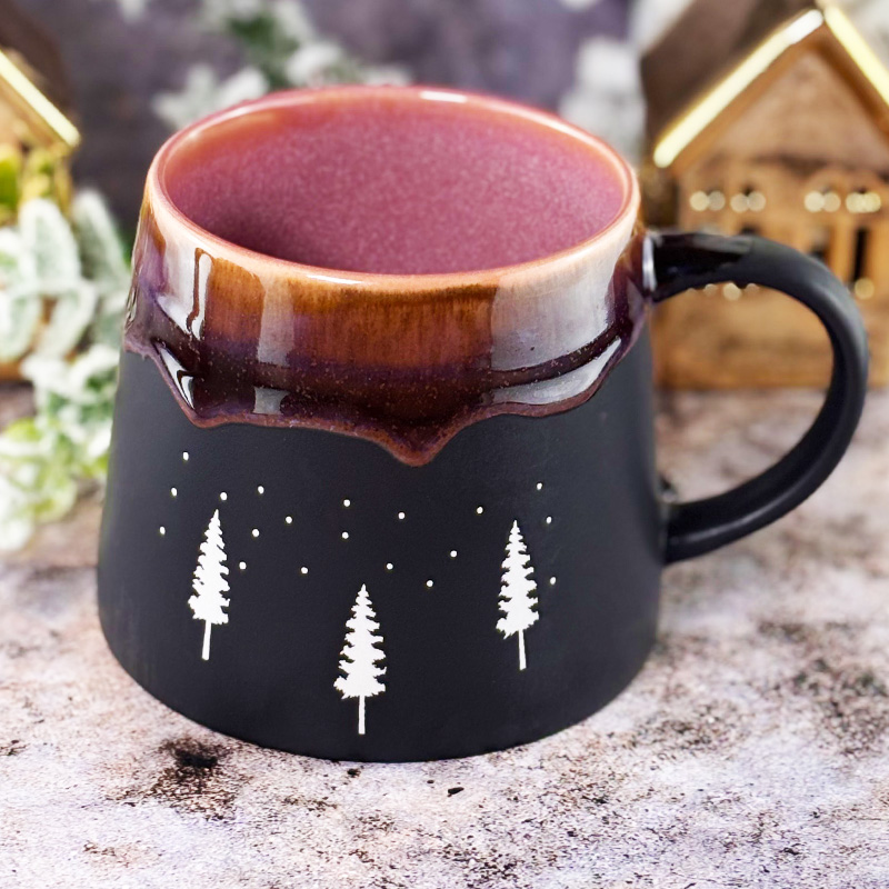 - Felület & dekor: matt bevonat, kontrasztos fehér fenyők és hópelyhek fekete háttérrel; a reaktív máz változatos, egyedi tónusokat eredményez