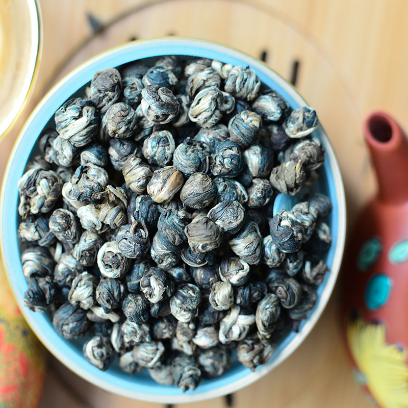 - ez a tea a világ teáinak egyik legcsinosabb kincse. Dél-kelet Kínában terem. Több, mint 100 éve kizárólag a legfinomabb és legfiatalabb zöldtea levelek alkotják ennek a ritkaságnak az alapját. A még nem teljesen száraz leveleket hatszor összekeverik friss, finoman illatos jázminvirágokkal, majd leszűrik, és kézzel apró gyöngyökbe tekerik. A levél magába zárja a finom jázmin aromát és csak a forrázáskor engedi szabadon azt. A „két levél egy bimbó” felhasználása a főzetben is megmutatkozik. Színe elegáns pezsgő.
