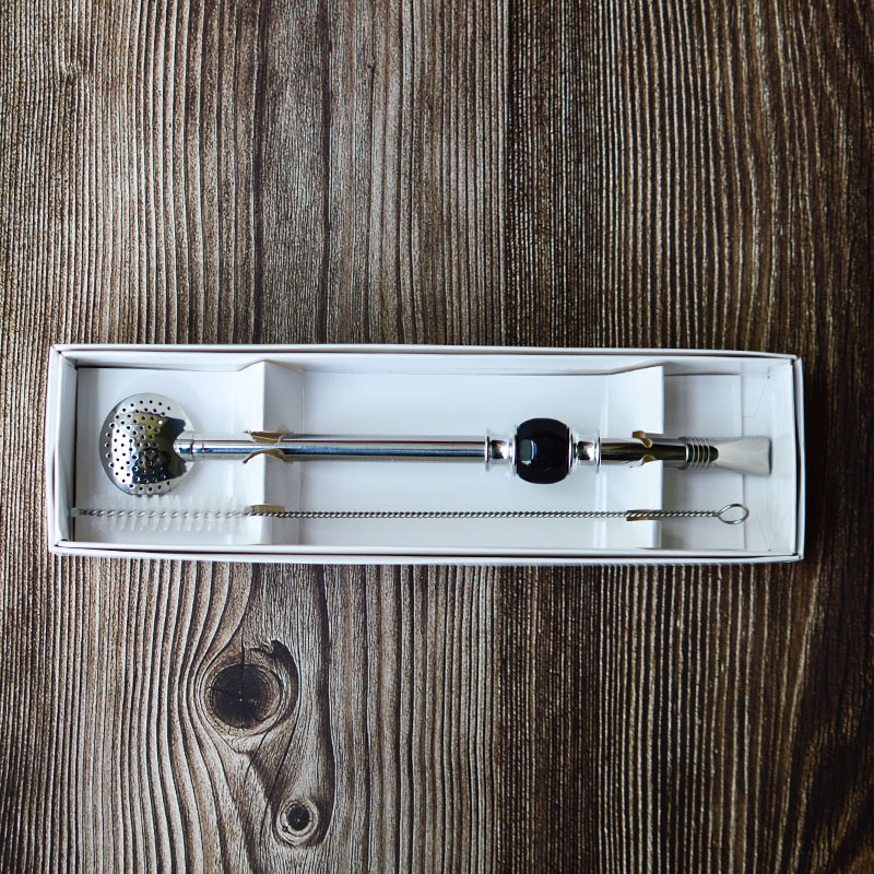 Ez a készlet egy kiváló minőségű rozsdamentes acél bombillát tartalmaz, amely tökéletes minden típusú mate számára, beleértve a chimarraót, valamint a tisztítókefét. A bombillát egy gyönyörű fekete színű ékszer díszíti. \n \nHossz: 21 cm