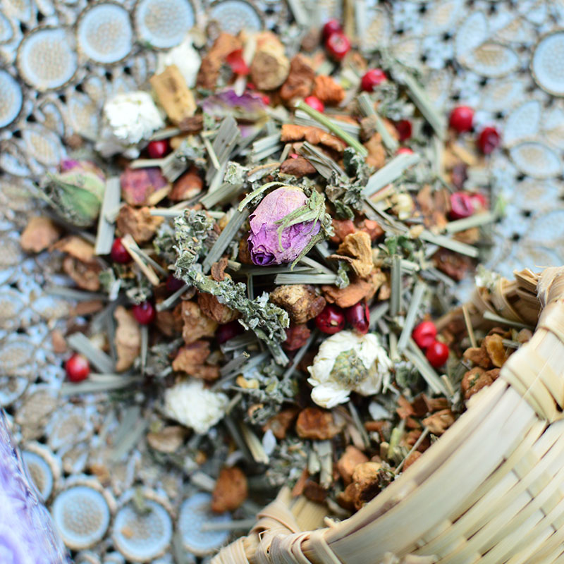 - alma, rózsabors, citromfű, málnalevél, fahéj, jázminvirág, rózsabimbó.