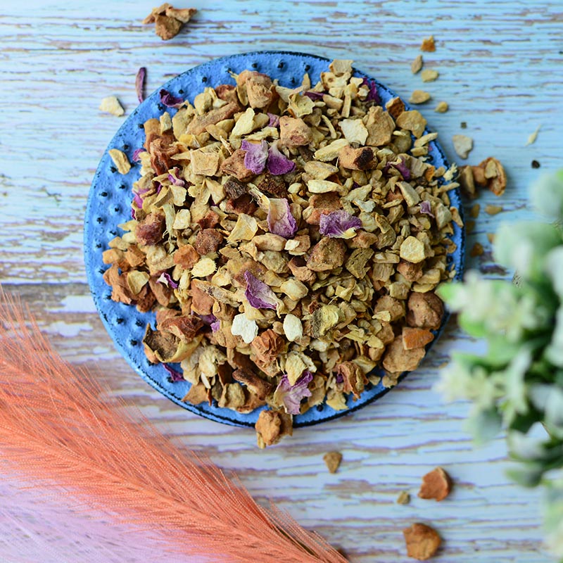 - citromhéj, édesgyökér, borsmenta, feketebors, gyömbér, rózsaszirom, alma darabok, narancshéj.