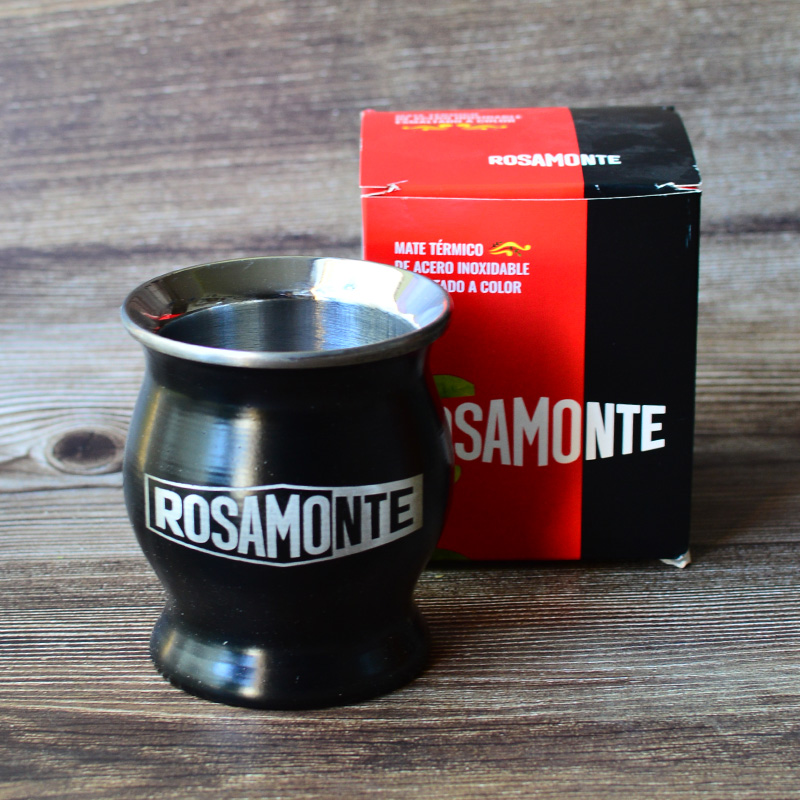 Ez egy fekete rozsdamentes acél tök Rosamonte logóval az oldalán. A fém tökök rendkívül könnyen tisztíthatók és karbantarthatók, emellett tartósak és könnyűek. A rozsdamentes acél tökök ugyanazt a duplafalú technológiát használják, mint a termoszoknál, ami azt jelenti, hogy a párja addig marad melegen (vagy hidegen), ameddig szüksége van rá.