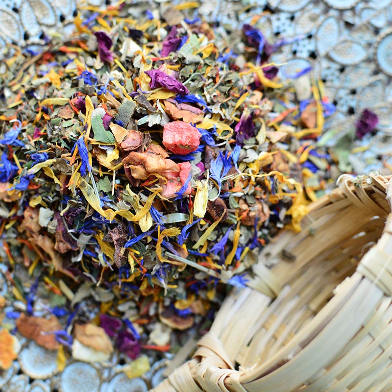 - alma darabok, szederlevél, malagaszőlő, narancshéj, sáfrány, borsmenta, citrom mirtusz, citromhéj, csalánlevél, eperdarabok, kék búzavirág, körömvirág, rózsaszirom