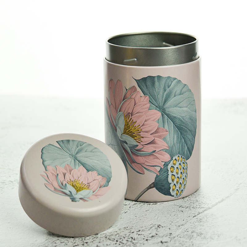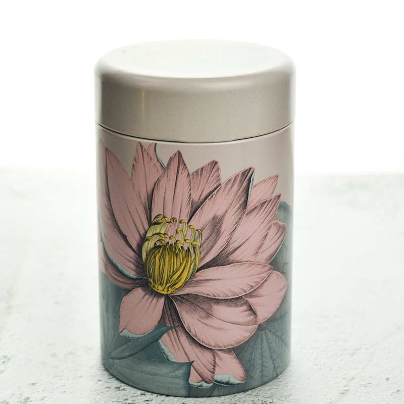 125 grammos fém tároló doboz lótusz mintával, mely kitűnően alkalmas szálas teák tárolására.