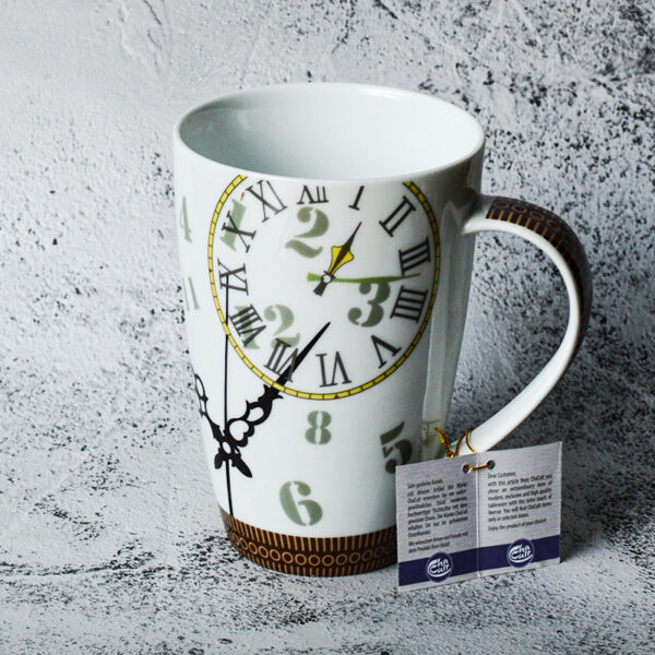 Mennyi az idő? Tea idő! Ez a rendkívüli és időtlen dizájn antik óramutatókat és egy római számlapot ábrázol, amely egy történelmi nagypapa órára emlékeztet egy hangulatos nappaliban. A tompa barna és szürke tónusok finom színvilága kiemeli ennek a klasszikus dizájnnak a gáláns karakterét. A mega bögre nagy, 0,5 l-es töltőkapacitással rendelkezik, ezért ideális teák fogyasztásához gyakori főzés nélkül, valamint nagy kevert kávéitalokhoz.