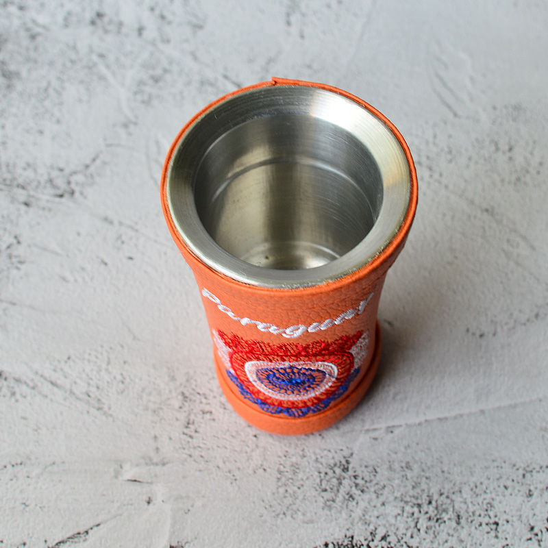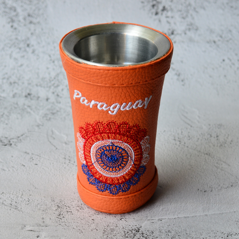 Színes fém edény yerba mate számára, szürke ökobőrből, a paraguayi zászló színeiben pompázó motívummal
