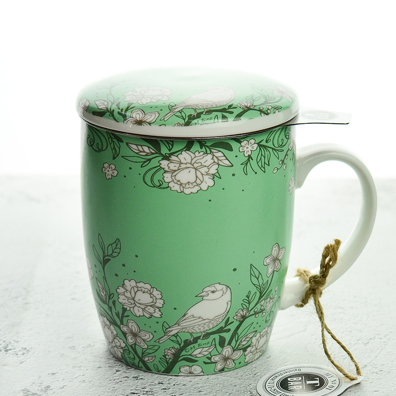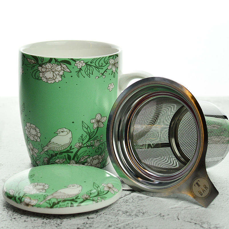 Porcelán bögre, rozsdamentes acél szűrővel, mely kitűnően alkalmas szálas teák készítéséhez.
